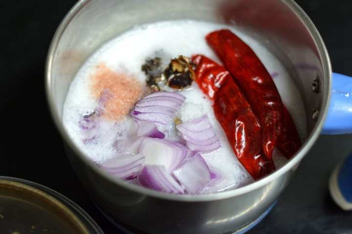 - Add chopped onions/shallots, dried red chillies, tamarind and salt.