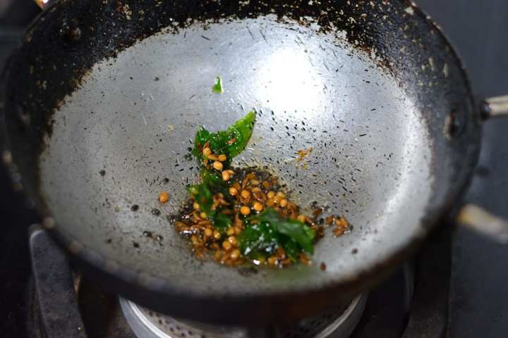 - Remove onto bowl. Meanwhile, heat oil for tempering. Add mustard seeds, cumin seeds, urad dal. As they turn golden and begin popping, add asafoetida and fresh curry leaves. Add it to the chutney.