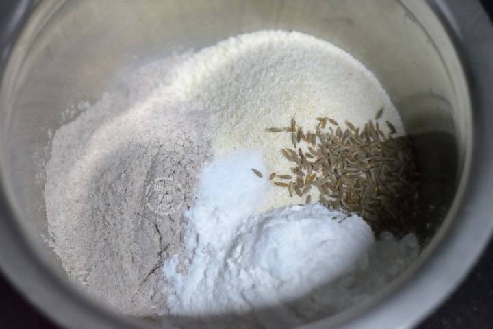 - In a mixing bowl add ½ cup ragi flour, ¼ cup rice flour, ¼ cup rava (unroasted semolina), ½ teaspoon cumin seeds along with salt as needed.