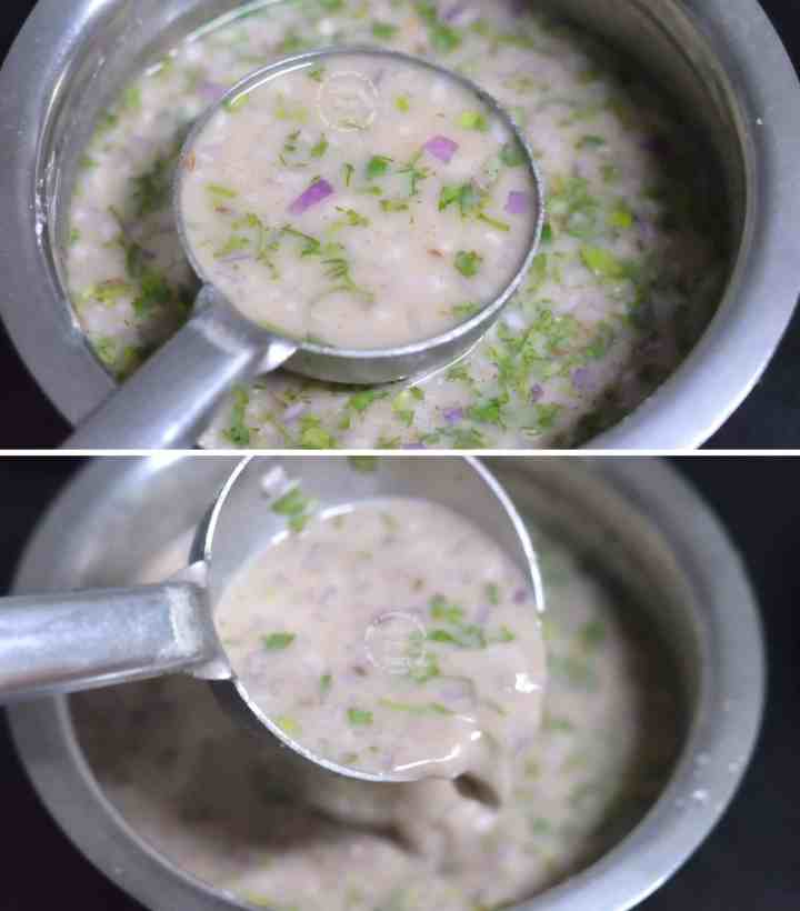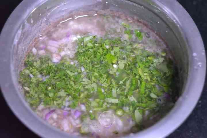 - Add about 2 cups of water and mix well without any lumps. Next add 1 onion finely chopped along with 2-3 tablespoon finely chopped coriander leaves and 1 green chilli finely chopped. Mix well.