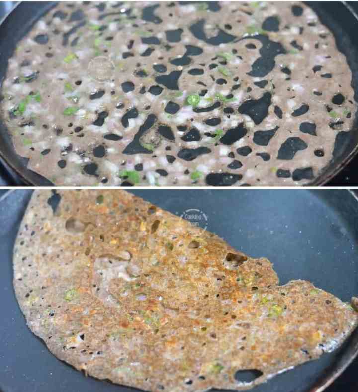 Ragi Rava Dosa can also be easily made in a nonstick dosa tawa, set at medium flame and if the tawa has rims, it works the best as the batter does not spill out while being poured. Continue cooking the same way and once golden brown, remove from heat.