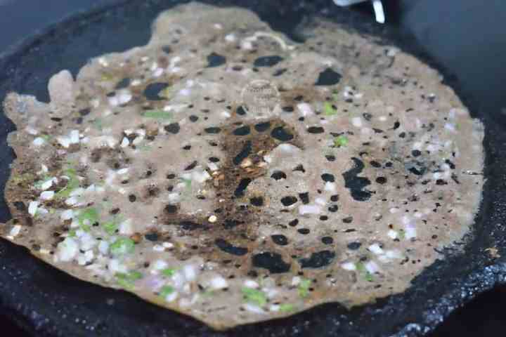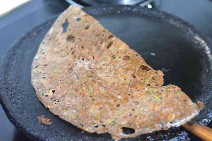 Adjust the amount of water as ragi dosas are being made. If it is too thick, the dosa doesn’t turn out lacy and rather becomes lumpy. While too much water makes it difficult to remove the dosa from the pan.
