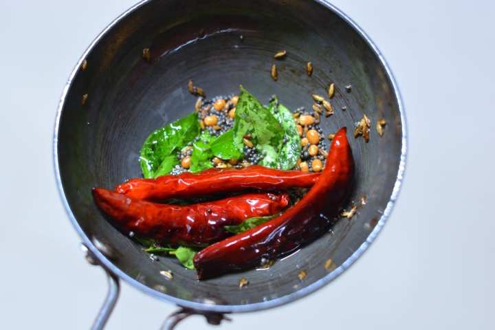 - Meanwhile, heat oil in a tempering pan. Add mustard seeds, cumin seeds and urad dal along. As the mustard & cumin seeds splutter and urad dal turns golden, add dried red chillies. Fry for 30 secs until the chillies turn a deeper shade. Finally add fresh curry leaves and remove from heat.