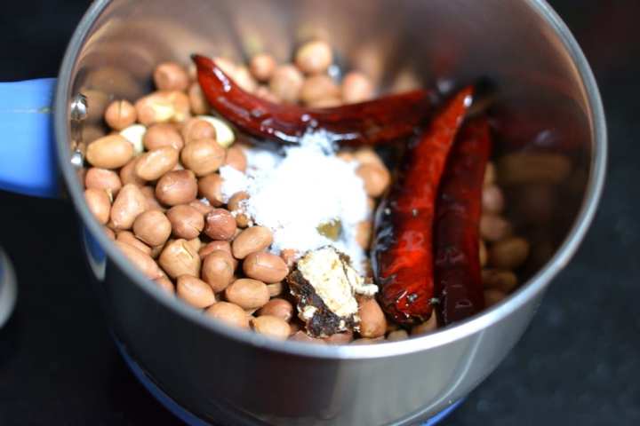 In a mixer add roasted peanuts, salt, a small marble sized ball of tamarind and roasted red chillies from the tempering.