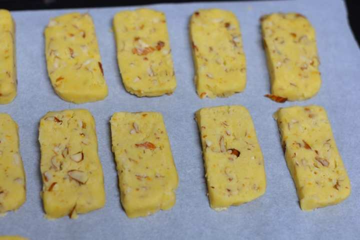 - Preheat the oven at 160°C for 15 mins. Remove the dough from freezer. Slice it into cookies of thickness half centimeter.