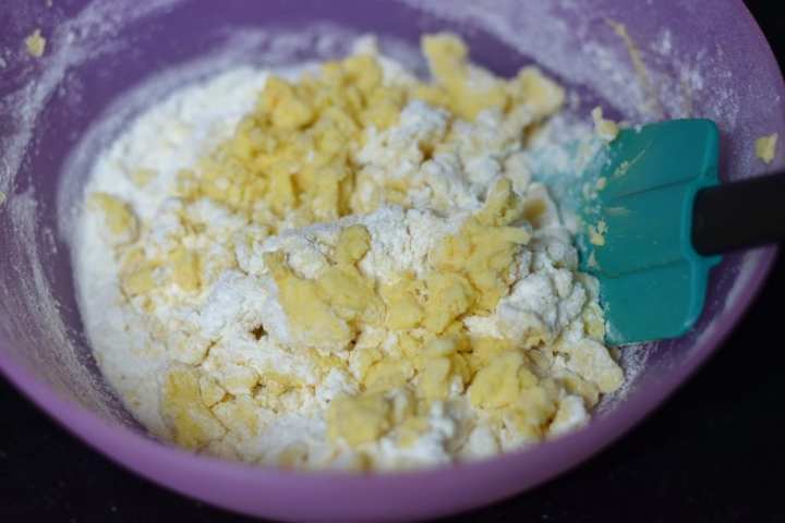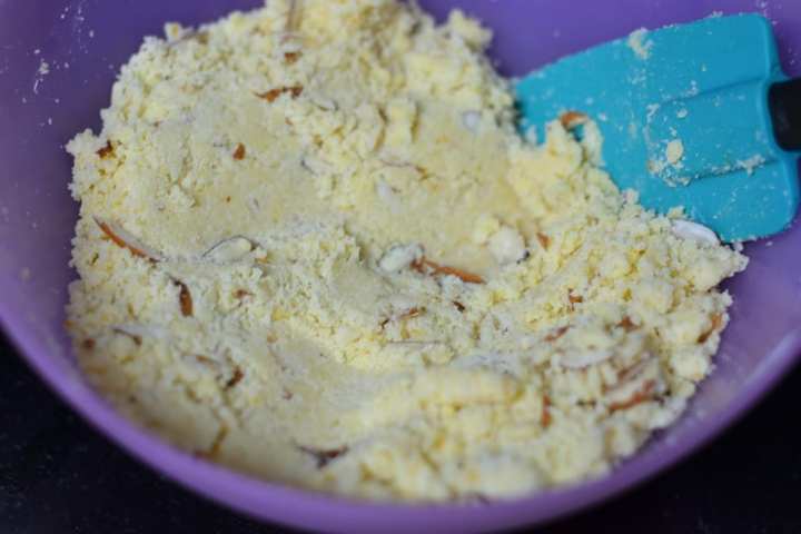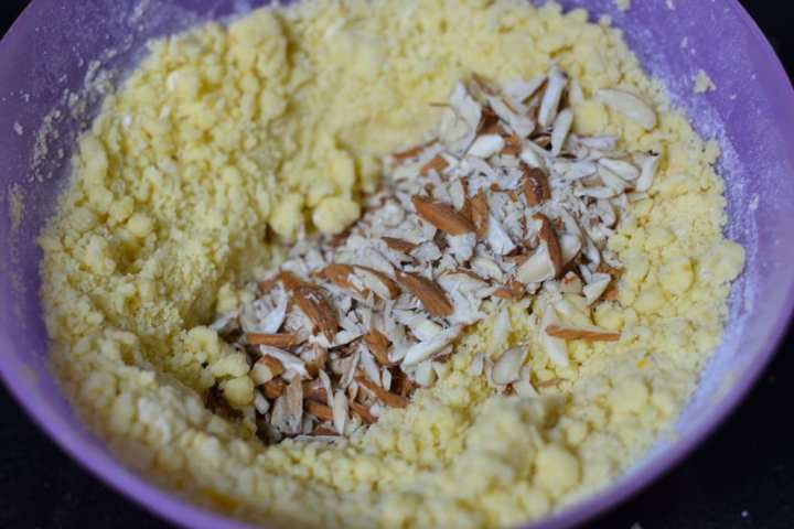 - As the flour begins to combine with the butter mixture, add slivered almonds. Mix it well.