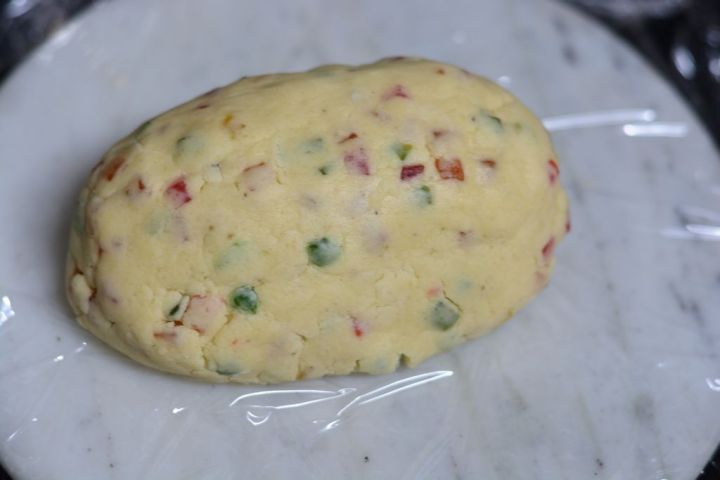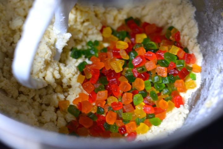 - Add ½ cup tutti frutti and quickly mix for another 1-2 mins until tutti frutti is incorporated into the dough.