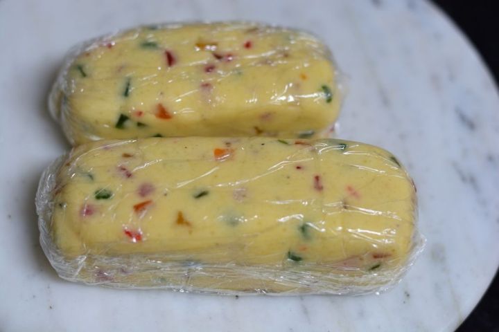 - Now roll the cling film tightly and shape the dough as desired. I chose to keep it square shaped; you can roll it into a circle shape too. Place this in fridge to chill for 2 hours at the minimum for upto 8 hours or overnight.