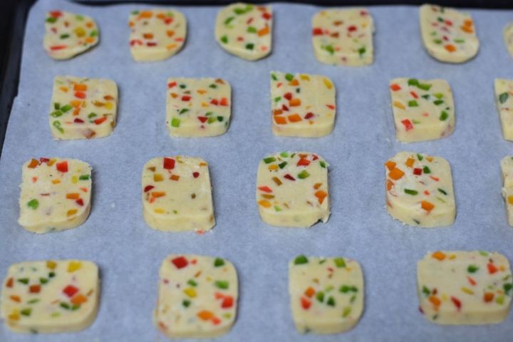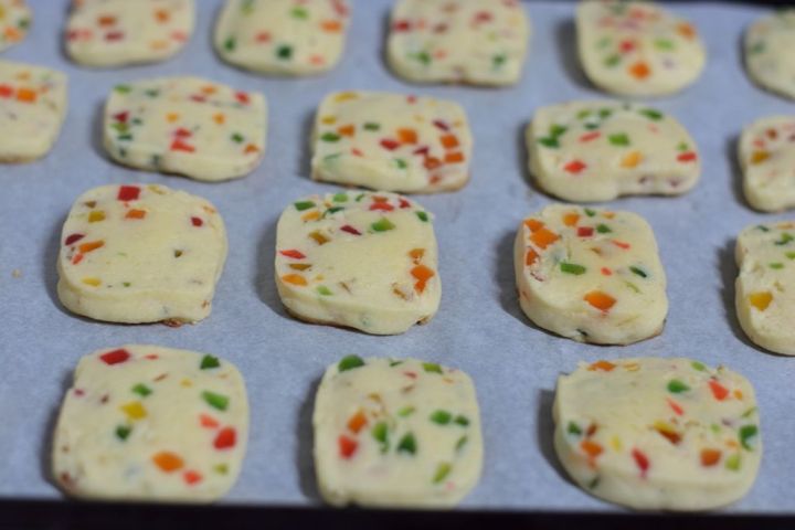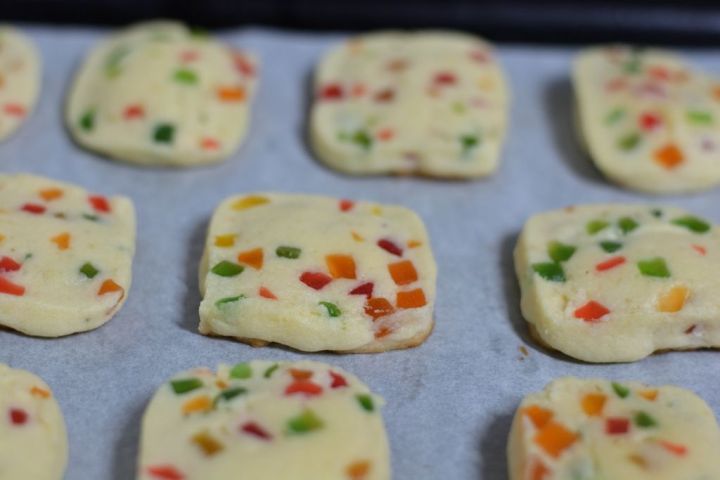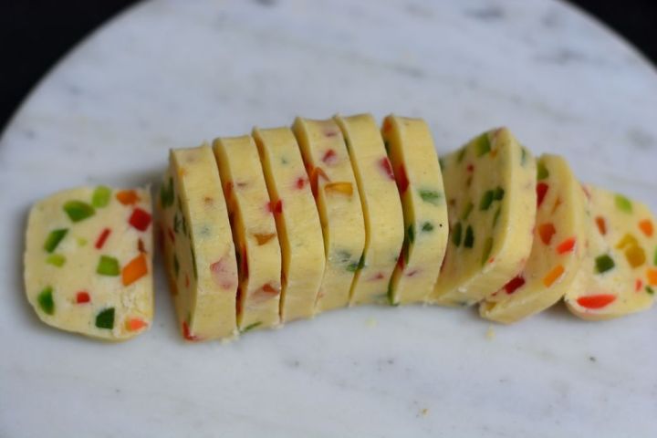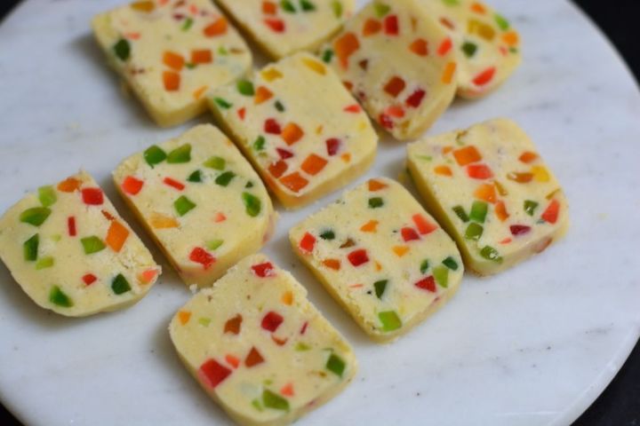 Just like the Dilpasand recipe, I had Karachi Fruit Biscuits recipe on my to-do list for a long time now. When I had finally hunted down a pack of tutti frutti, it felt like that time had come to make the saved recipe from years ago. By default, these karachi biscuits are eggless. The biscuit dough is essentially creamed up butter and powdered sugar along with all-purpose flour. Interestingly, this is one cookie (more a crisp biscuit) recipe that also uses custard powder. But I don’t usually stock ready-to-use custard powder at home. I use corn flour to make Fruit Custard at home, so I ended up using the same in this karachi biscuit recipe too.