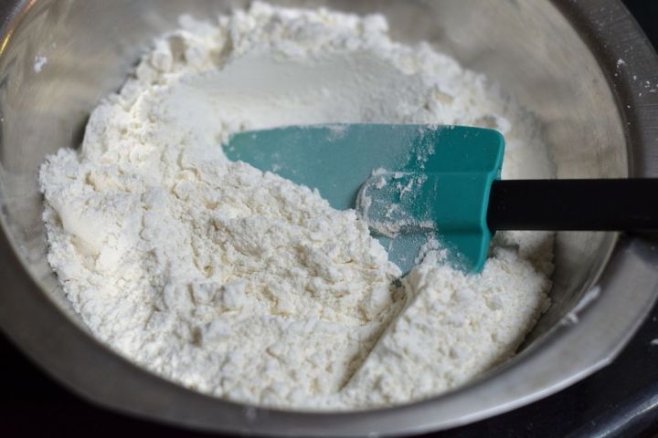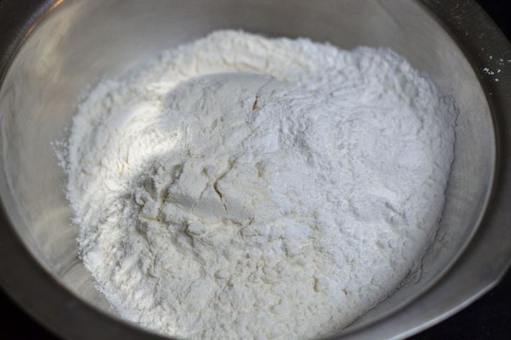 - In a mixing bowl add 1 cup all purpose flour, 2 tablespoon corn flour (both spooned & leveled) and a pinch of salt. Mix it well together using a spatula.