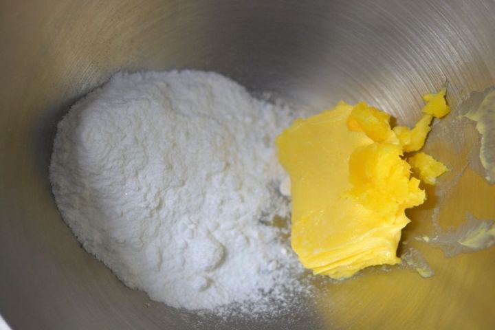 - Add ½ cup butter (at room temperature) and ⅓ cup powdered sugar in your stand mixer mixing bowl.