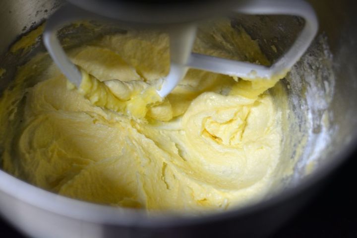 Using the paddle attachment on lowest speed, cream butter and sugar together until it is light and creamy. This can be done using a hand mixer/beater/whisk too.