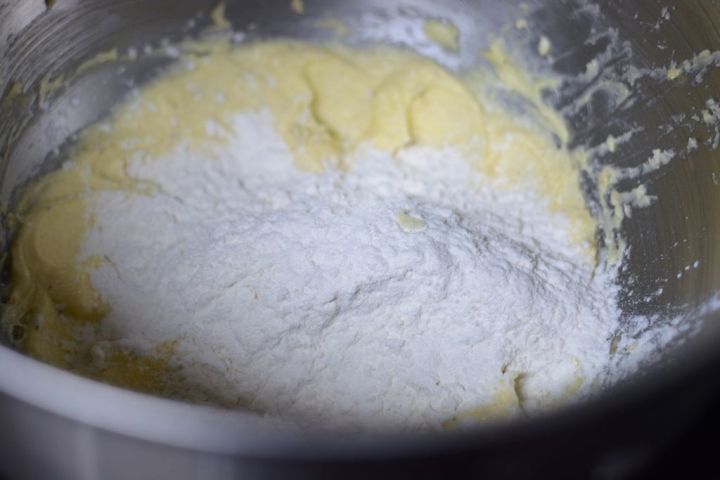 While the mixer is running on lowest speed, add the flour mixture in three parts.