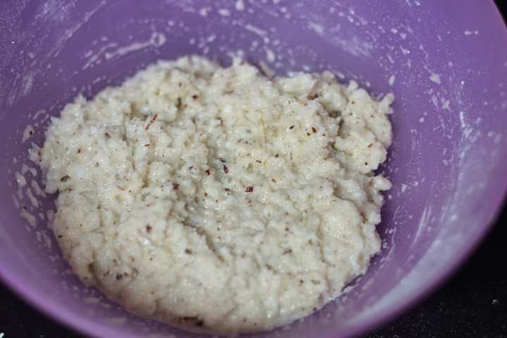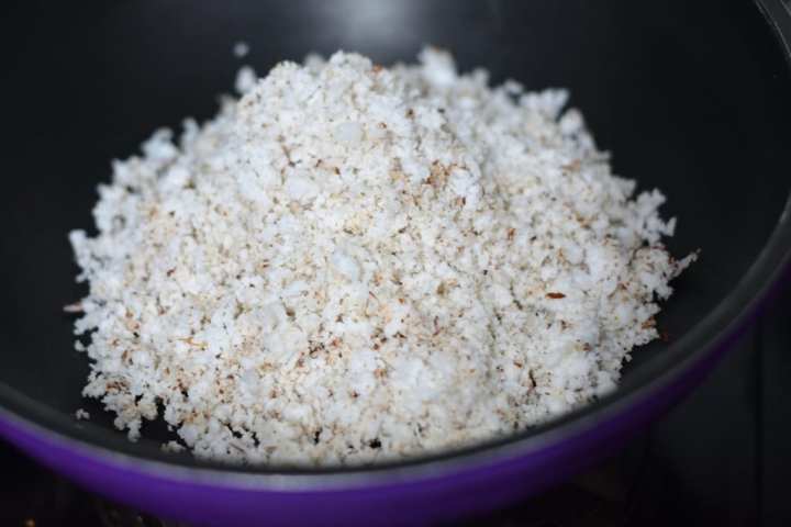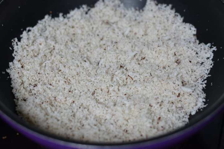 - Dry roast the fresh grated coconut for 4-5 mins on low flame until it is dry. Make sure not to change the color of the coconut.