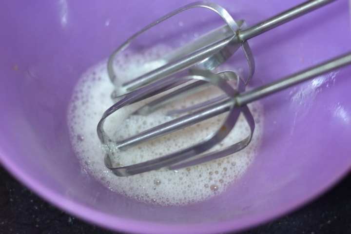 In a mixing bowl, add egg white from one egg. Whisk it until it is frothy for 2-3 mins on low speed.