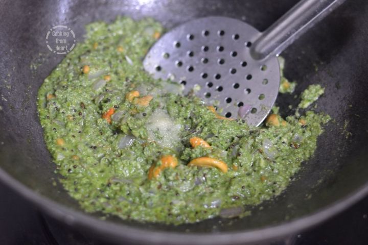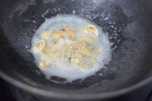 - In a pan heat 2 teaspoon oil and add ½ teaspoon mustard seeds. As they splutter, add 6-8 Cashews. Roast until golden brown.