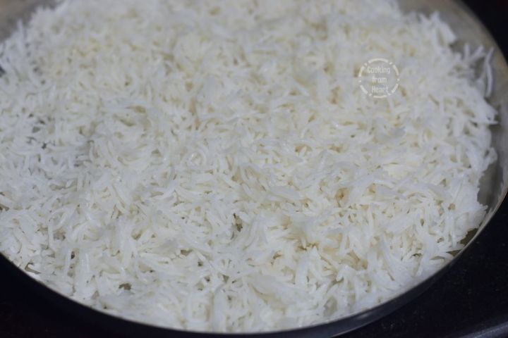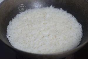 - Spread the cooked rice on a large plate and let it cool down completely.