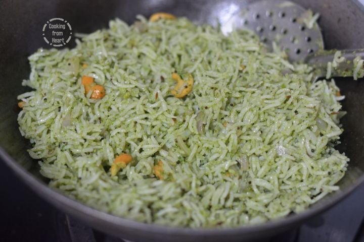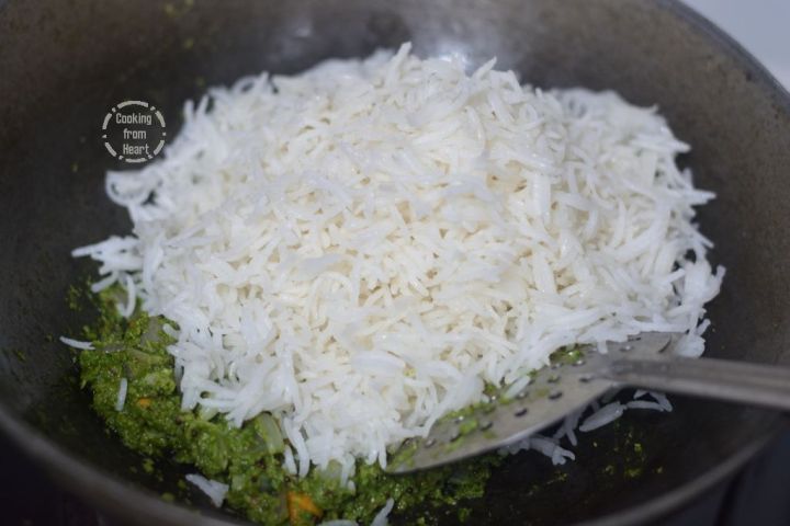 I used Basmati Rice for making this coriander pulao but any rice variety works. Make sure the rice is al-dente and not cooked to a mush. Having the rice at room-temperature completely cooled down works the best.