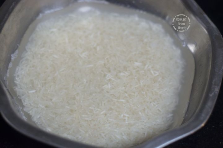 - First soak 1 cup basmati rice in enough water for 15-20mins. This helps in cooking the rice better.