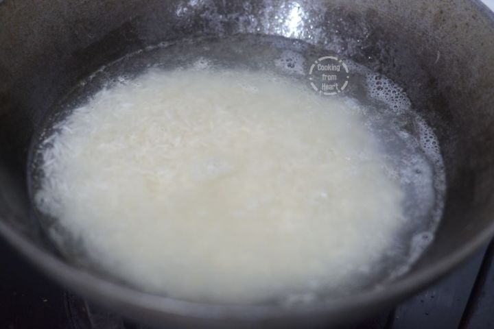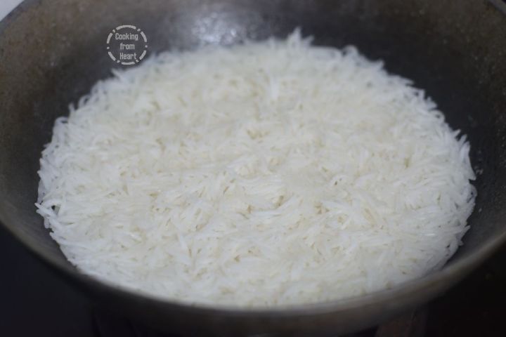 - In a thick bottomed pan, heat 2 cups of water along with ½ teaspoon ghee/oil and salt needed for the rice. As the water begins to boil, add the soaked basmati rice.