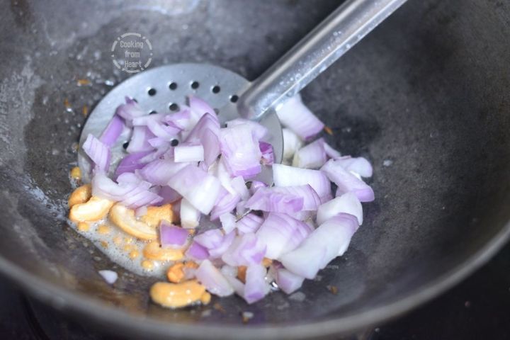 In a pan heat 2 teaspoon oil and add ½ teaspoon mustard seeds. As they splutter, add 6-8 Cashews. Roast until golden brown.