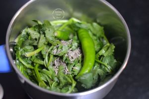 - Meanwhile add 1 cup fresh coriander leaves along with 2 green chillies and ½ teaspoon cumin seeds in a mixer-grinder.