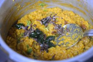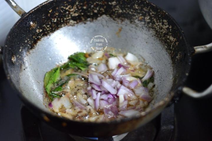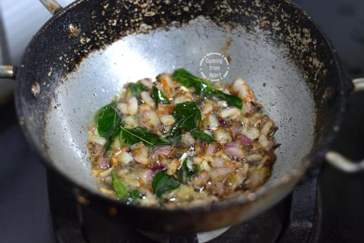 - Meanwhile in a small pan heat 2 teaspoon ghee/oil. Add ½ teaspoon mustard seeds, ½ teaspoon cumin seeds, ¼ teaspoon asafoetida and few fresh curry leaves. As they begin to crackle, add 6-8 shallots finely chopped.