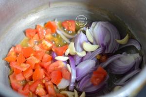 First wash and set aside 1 cup raw rice & ½ cup toor dal. In a pressure cooker heat 1 teaspoon oil and add 1 large onion chopped along with 1 medium tomato chopped and 5-6 garlic cloves. Fry for 3-4 mins.