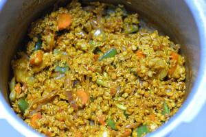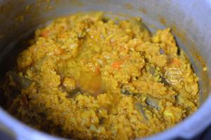 - Pressure cook for 5-6 whistles on medium flame. The rice and dal should be cooked well without any water remaining.