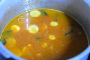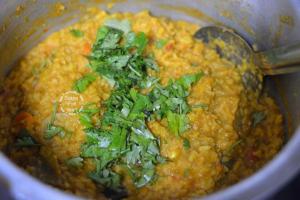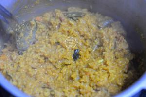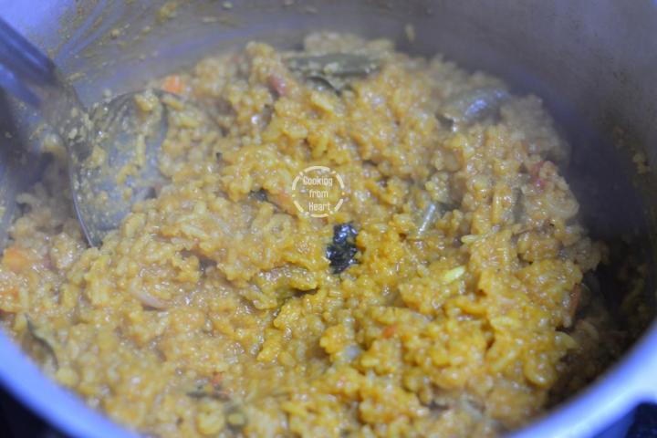 Pressure cook for 5-6 whistles on medium flame. The rice and dal should be cooked well without any water remaining.