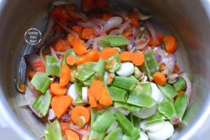 - Sambar rice tastes the best when there are vegetables added. I usually add pumpkin, carrots, broad beans, brinjal, radish, turnip and even potatoes or green peas at times. I don’t usually add drumstick as it could get overcooked easily.