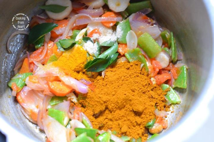 - Add 2 teaspoon sambar powder, ¼ teaspoon turmeric powder, ¼ teaspoon asafoetida, few fresh curry leaves. Fry for a couple of minutes until there is no raw smell from powders.