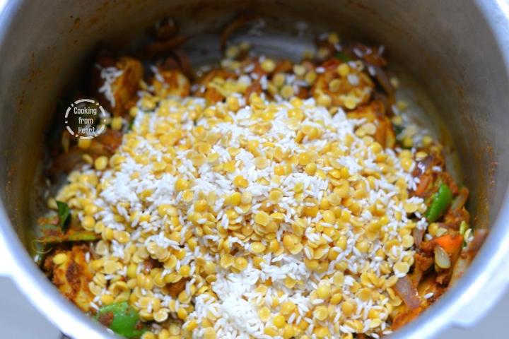 - To enable faster cooking of rice and dal, I usually wash and soak it for sometime while I chop the vegetables. It is not mandatory, but helps for sure.