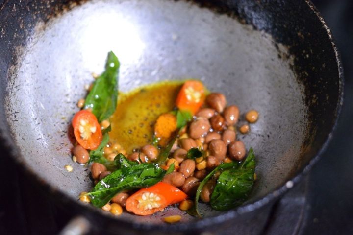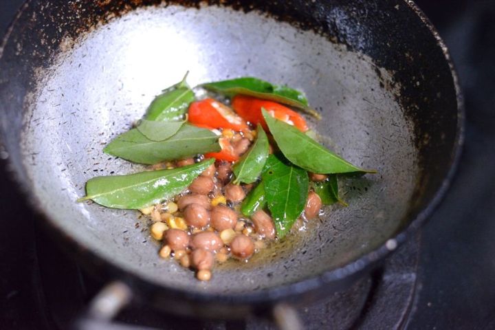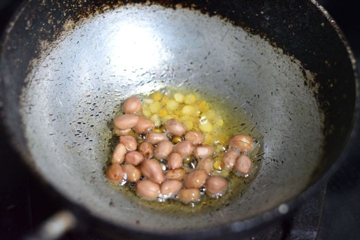- In a small fry pan heat 1 tablespoon gingelly oil. Add ½ teaspoon mustard seeds, 1 teaspoon each of urad dal and chana dal. Next add 1 tablespoon peanuts.