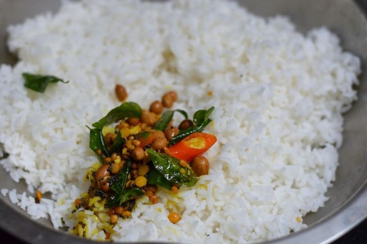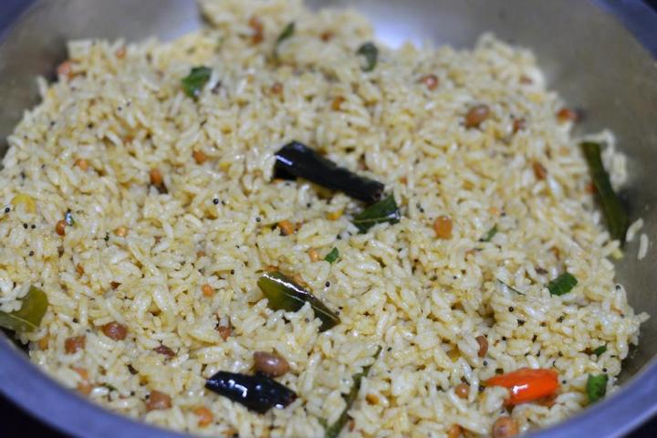 Leftover rice works wonderfully well when you have to make Kalanda Sadam mixed/variety rice recipes or fried rice recipes. The most basic thing to keep in my mind when making Puli Sadam or any other variety rice recipe is that the rice should be cooked and cooled down completely. Most of the times when I am making Tamarind Rice or Lemon Rice, I don’t have left over rice. I usually cook fresh for every meal and what I usually do in that scenario is make my rice well in advance. I cook the rice regularly in my pressure cooker and I reduce the water by ¼ cup than my regular measure. Once the pressure is dropped, I invert the rice (without mixing with a spoon/fork) onto a large plate or bowl and drizzle 1-2 teaspoon of oil on top. This helps remove the stickiness from rice. I let the rice cool down completely under the fan (especially if pressed for time) and it works out well.