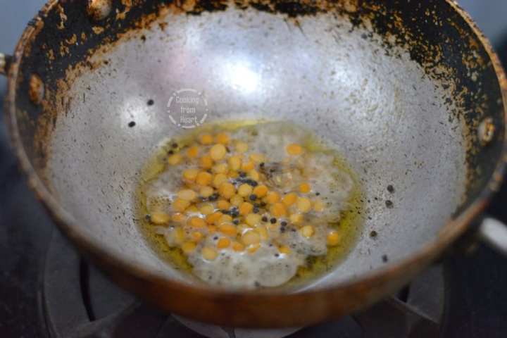 - Heat ghee in a pan and add mustard seeds, urad dal and chana dal. Fry them until golden.