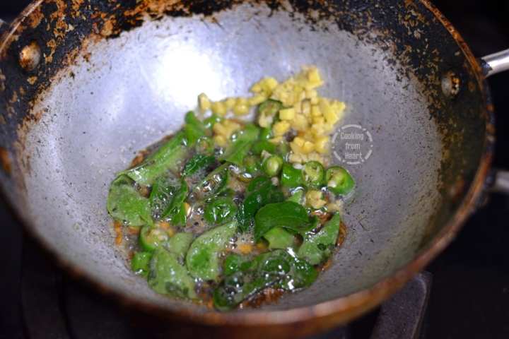3. Next add finely chopped green chillies, ginger and asafoetida. Fry for a minute.