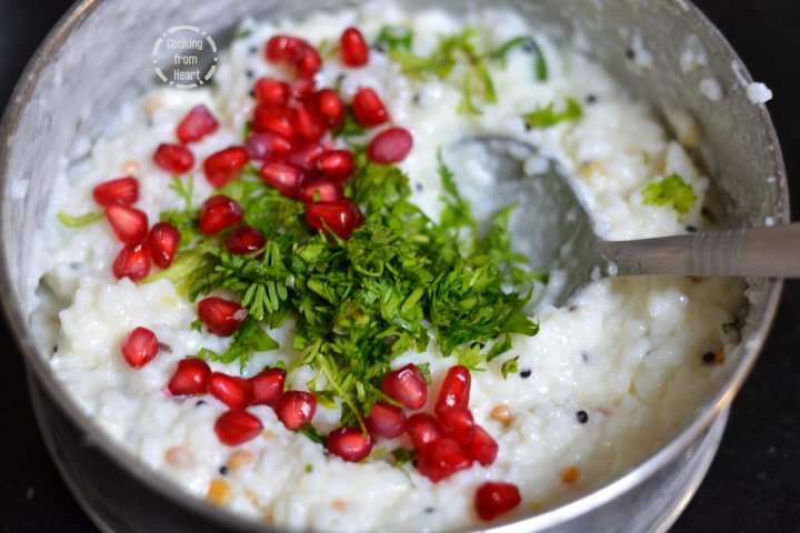 Daddojanam is Andhra style Curd Rice recipe and it has a few assorted spices apart from the regular ingredients. I love using pomegranate pearls in my curd rice – its adds a mild sweetness to the rice, along with the texture. I also add finely chopped ginger and green chillies, which add the much required spiciness. Now, I wouldn’t make curd rice ever without curry leaves and fresh coriander leaves. I always prefer using homemade curd full cream milk that’s fresh. If you are taking this on a trip or for your lunch box, it is better to add some milk so that the curd doesn’t turn sour. Check out the notes for more information.