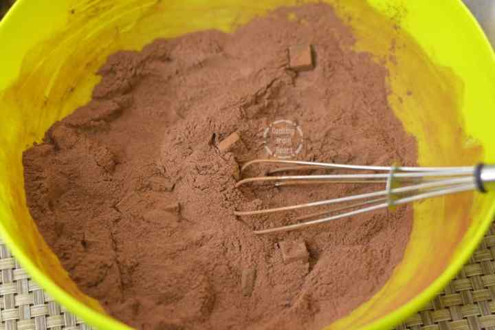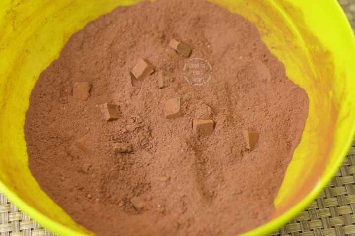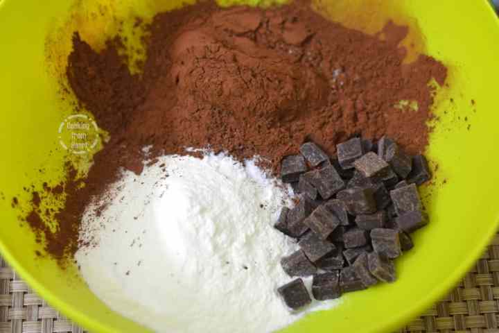 - In a mixing bowl add ¾ cup of milk powder or dry milk, ½ cup dutch-processed unsweetened cocoa powder and ⅓ cups semi-sweet dark chocolate chunks.