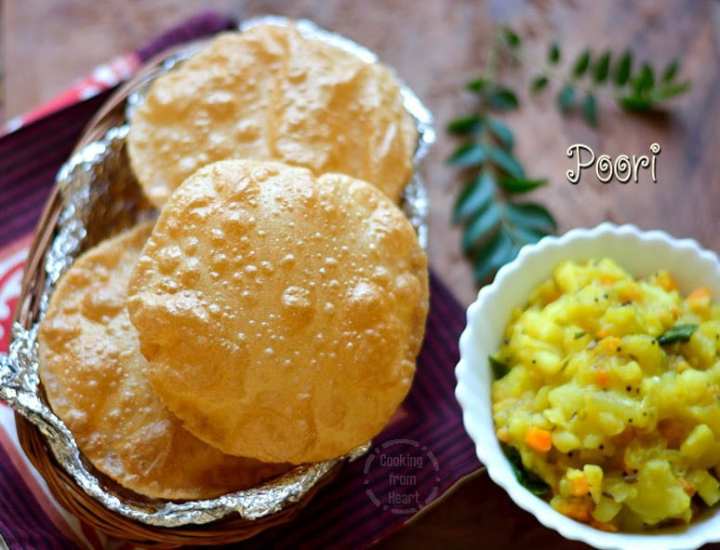 - Meanwhile, heat oil in a deep pan. Once the oil is hot enough, set the flame on medium. Do a little test by dropping a tiny piece of dough into the oil and if it immediately raises to the top, oil is ready. Carefully slip a rolled out Poori into the oil and as it begins to raise up, press it gently with the slotted spoon. The Poori would begin to puff up, quickly turn it to the other side and cook until golden brown. Remove onto a tissue paper. Repeat the same with rest of the rolled out Pooris.