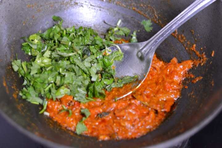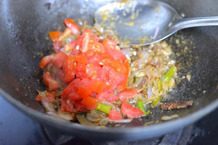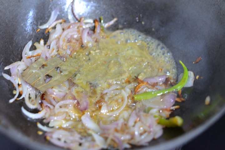 Next add the prepared paste and fry for a few minutes until the raw smell goes off.