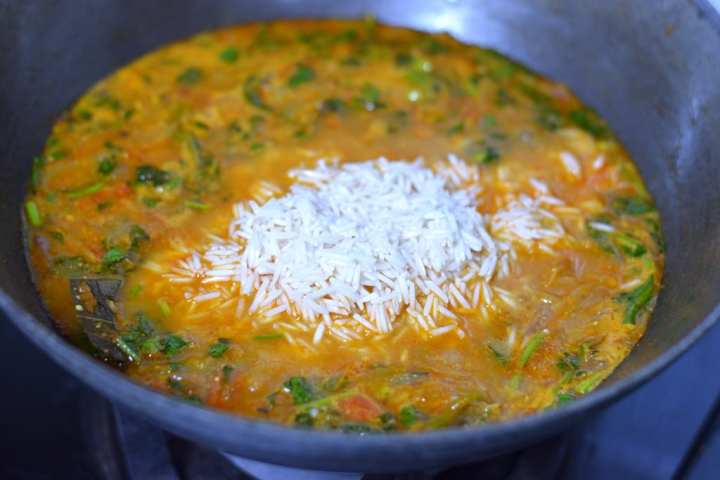 - As the water begins to boil, add soaked basmati rice – mix well.