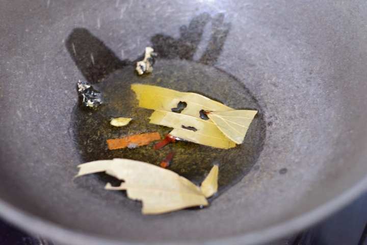 - In a heavy bottomed pan, heat oil. Add dried bay leaf, cloves, cardamom and cinnamon. Fry for few seconds.