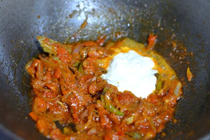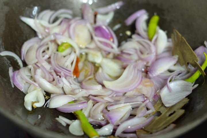 In a heavy bottomed pan, heat oil. Add dried bay leaf, cloves, cardamom and cinnamon. Fry for few seconds.