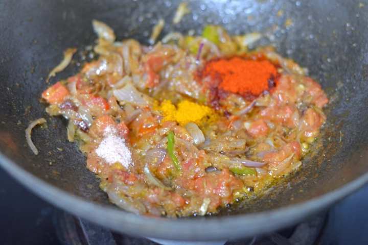 - Next add turmeric powder, red chilli powder and salt as needed. Fry off for 2-3 mins.
