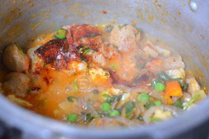 - If using meal-maker/soya chunks, add them along with fresh green peas. I added extra ½ teaspoon of red chilli powder as I felt that it was not as spicy. It is optional.