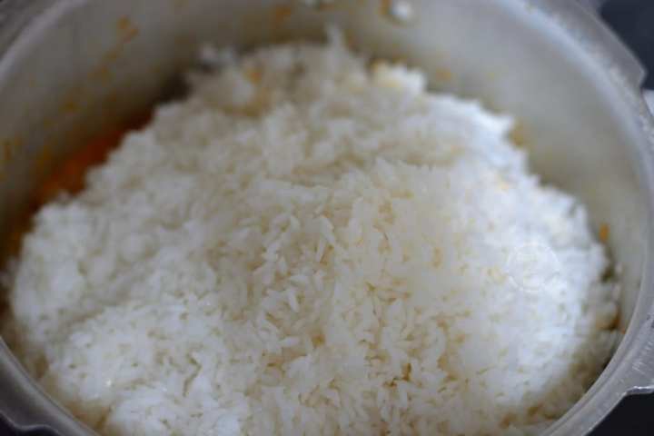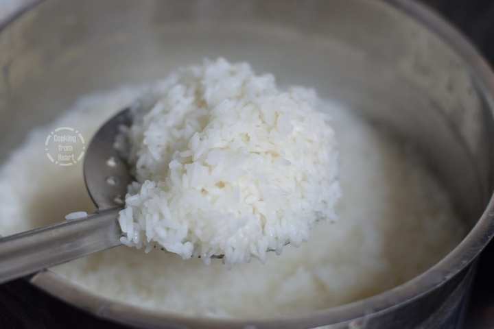 - Meanwhile, bring a large pot of water to rolling boil. Add salt as needed for cooking rice. Add the soaked rice. Cook covered for 7-10 mins on medium flame.