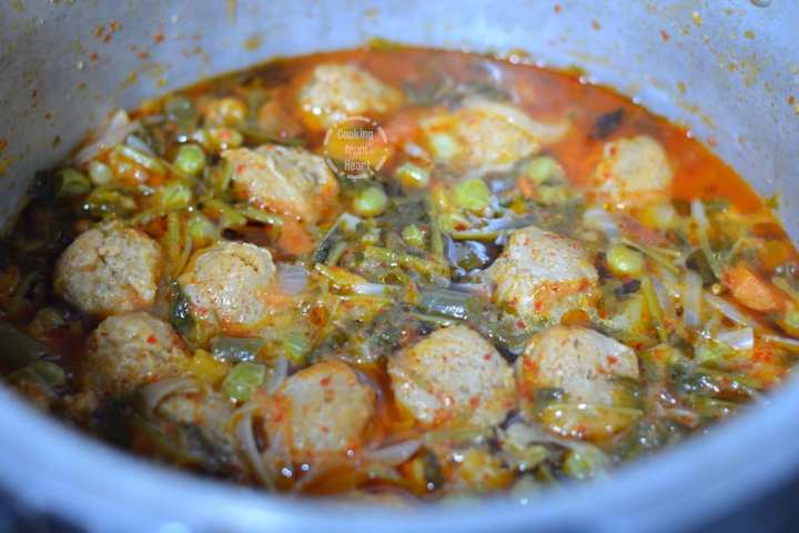 6. Add chopped vegetables, tomatoes and add salt as needed, cook for a couple of minutes.