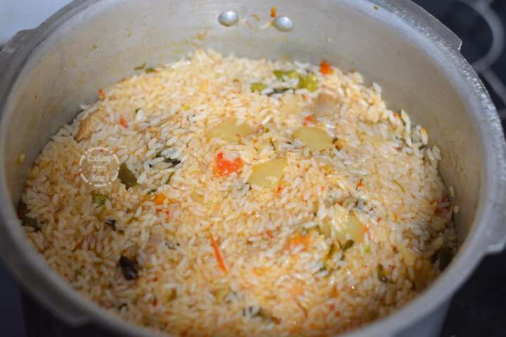 The dum process in this recipe is quite different from the other biryani recipes – there are layers. Rice is cooked until it is half cooked and then mixed over with the vegetable gravy. It is then put on dum by letting it steam over low flame. Traditionally this is cooked over wood fire and coals. At home, the easiest way to do this is to set the pressure cooker/pan on iron pan that’s on low flame. Alternatively, it could also be set in an oven.