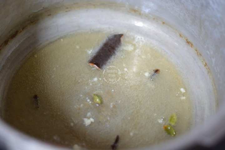 - In a pressure cooker, heat oil. Add cloves, cardamom, cinnamon and let them splutter.